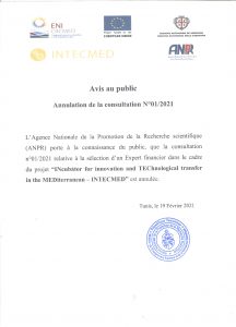 L’Agence Nationale de la Promotion de la Recherche scientifique (ANPR) porte à la connaissance du public, que la consultation n°01/2021 relative à la sélection d’un Expert financier dans le cadre du projet “INcubator for innovation and TEChnological transfer in the MEDiterranean – INTECMED” est annulée.